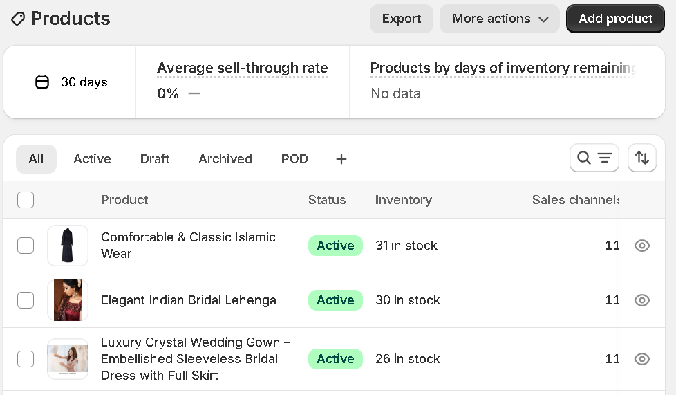 | Product | SKU | Description | Collection | Availability | Product type | Other details |